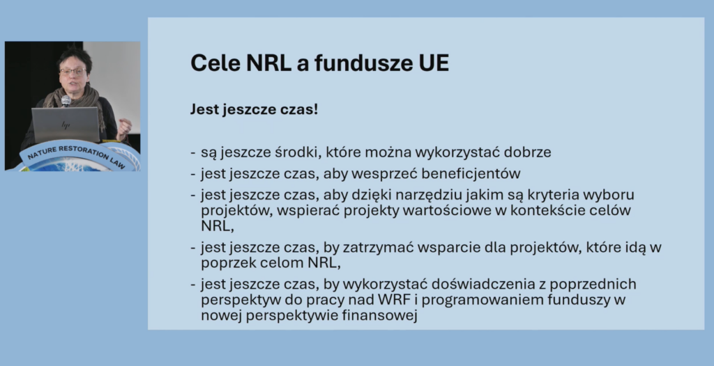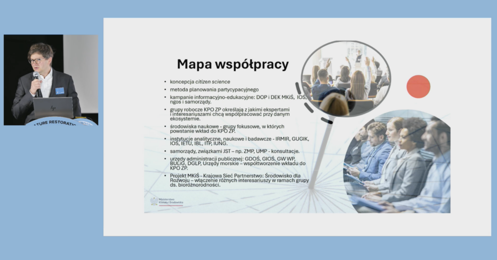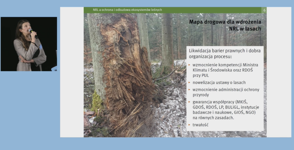 Piotr Kropiński, Zastępca Dyrektora Departamentu Ochrony Przyrody w Ministerstwie Klimatu i Środowiska opowiedział o kontekście środowiskowym i prawnym wprowadzenia rozporządzenia NRL, o działaniach już podjętych i zaplanowanych, by NRL weszło w życie. Podkreślił niezbędną pomoc ekspertów i ekspertek z NGO w pracy grup roboczych, dedykowanych poszczególnym obszarom, jakich dotyka NRL. Zaznaczył, że 3 ekosystemy są poza “zasięgiem” Min. Klimatu: ekosystemy rzeczne i morskie w Min. Infrastruktury, ekosystemy rolnicze w Min. Rolnictwa.