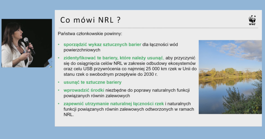 Dr Alicja Pawelec-Olesińska, hydrobiolożka od ponad 10 lat zajmująca się ochroną przyrody, w Fundacji WWF Polska kieruje Zespołem Ochrony Wód, współautorka Białej Księgi Polskich Rzek, opisującej wady i rekomendacje systemowych zmian dotyczących zarządzania rzekami w naszym kraju. W swoim wykładzie opowiedziała o stanie polskich rzek i o tym, czego NRL oczekuje w temacie ekosystemów rzecznych. Podzieliła się też dotychczasowym doświadczeniem przywracania rzekom ich naturalnego biegu.