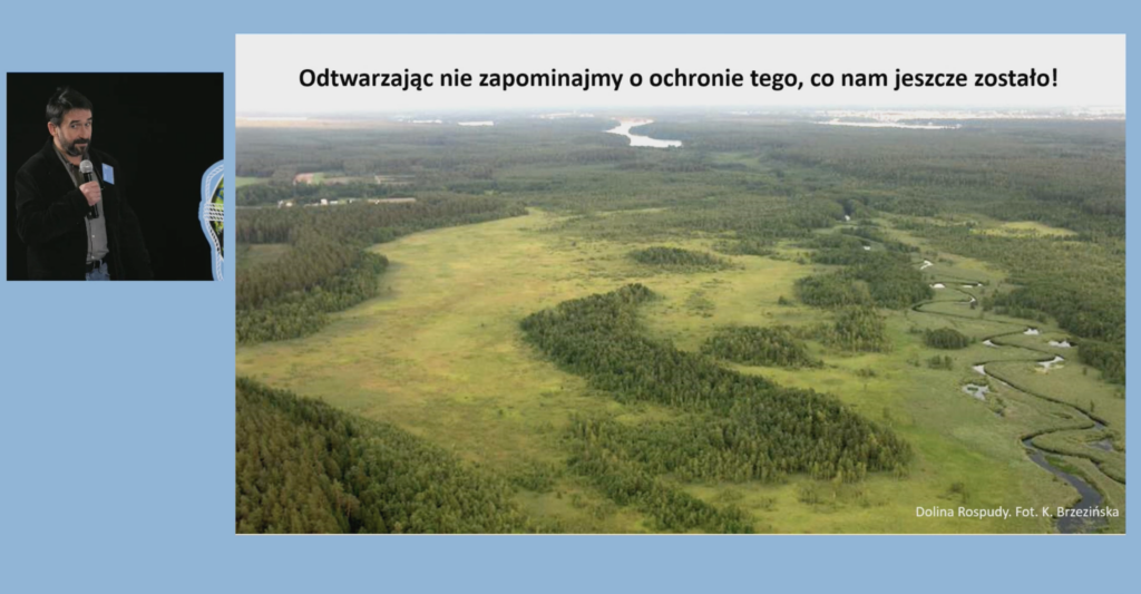 Prof. Wiktor Kotowski, naukowiec, popularyzator wiedzy w zakresie ochrony i odtwarzania mokradeł, działacz społeczny, współzałożyciel i członek Zarządu Centrum Ochrony Mokradeł, badacz ekosystemów bagiennych i wykładowca na Biologii na UW. Opowiedział w swoim wykładzie o … mokradłach i ich związkach z NRL. Podkreślił m.in, że mokradła są kluczowe dla powstrzymania spadku indeksu pospolitych ptaków krajobrazu rolniczego, a wzrost ich liczebności to jedno z założeń NRL.