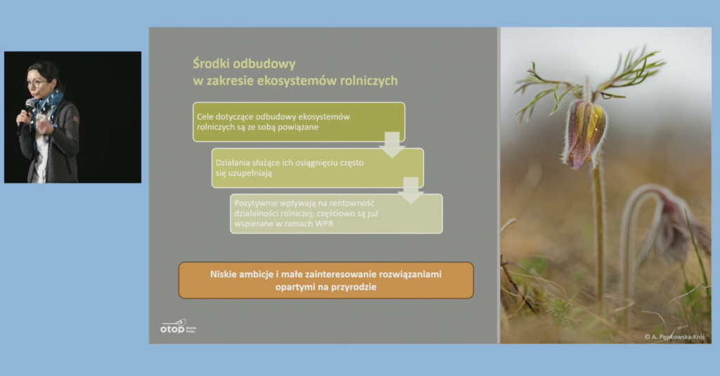 Aleksandra Pępkowska-Król,koordynatorka ds. rolnictwa w OTOP, Ogólnopolskim Towarzystwie Ochrony Ptaków, z którym związana jest od kilkunastu lat, koordynatorka prac koalicji “Rolnictwo dla przyrody”, działająca w grupie roboczej ds. rolnictwa Birdlife International, podjęła temat “NRL a rolnictwo”. Zwróciła uwagę m.in. na to, że wdrożenie NRL na ekosystemach rolniczych nie uda się bez zaangażowania ze strony rolników i rolniczek, a częścią angażowania powinno być adekwatne wynagradzanie rolników za ich pracę.